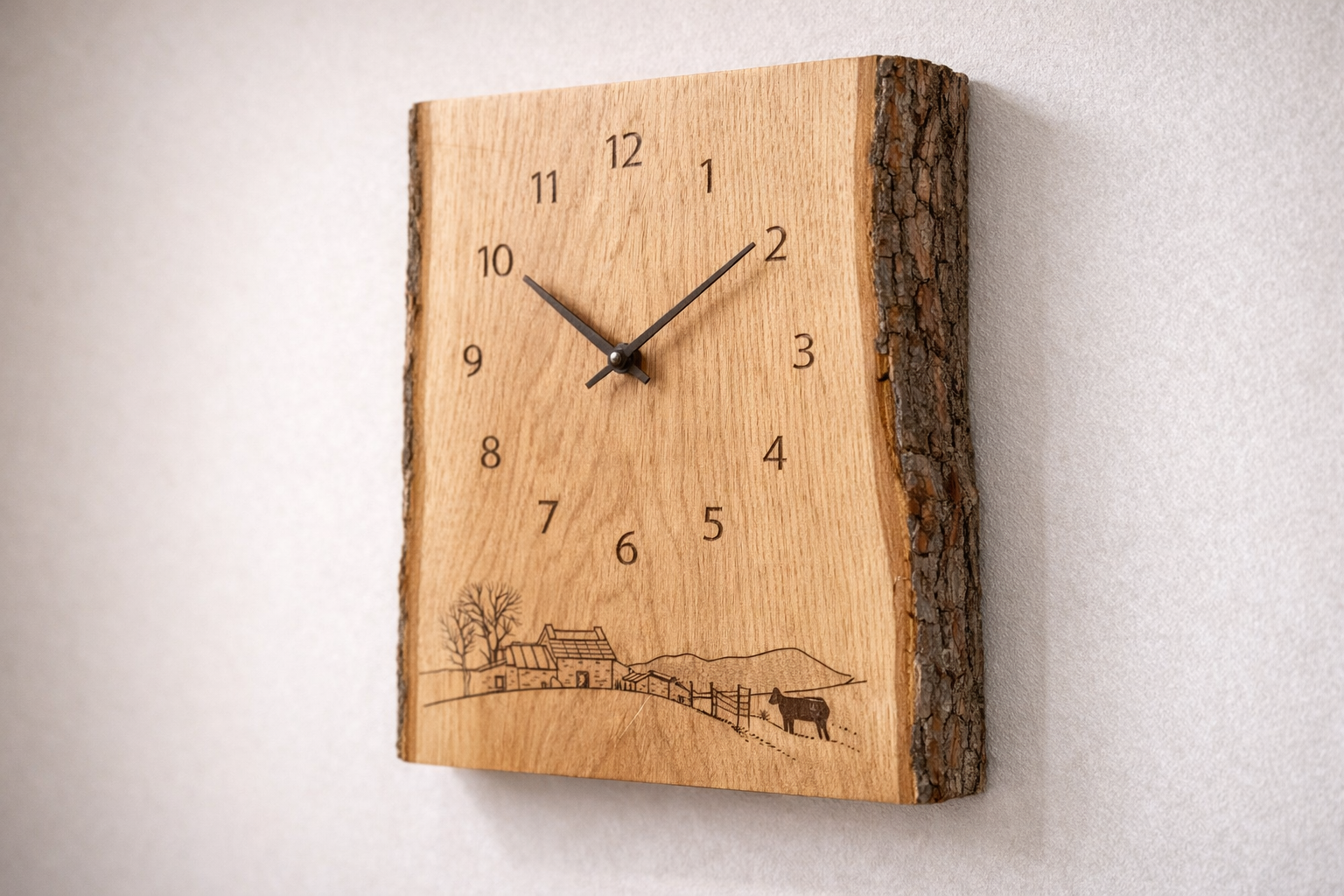 Tempo che scorre al ritmo della montagna. Ogni orologio è ricavato da legno con corteccia a vista, inciso con silhouette cimbre.